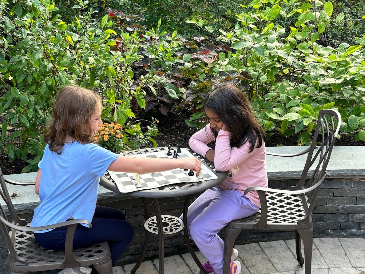 ID: Two kids playing chess at an outdoor table.