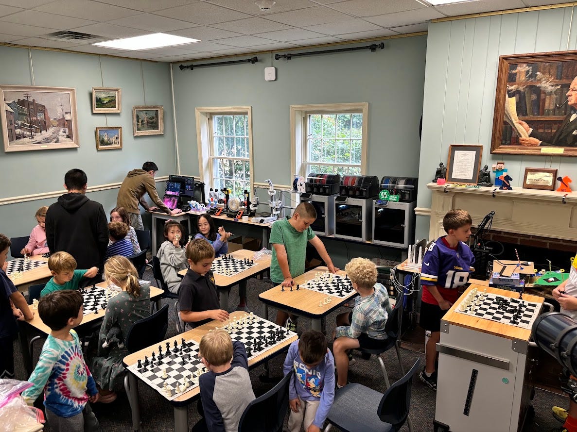 ID: kids playing chess in the Makerspace.