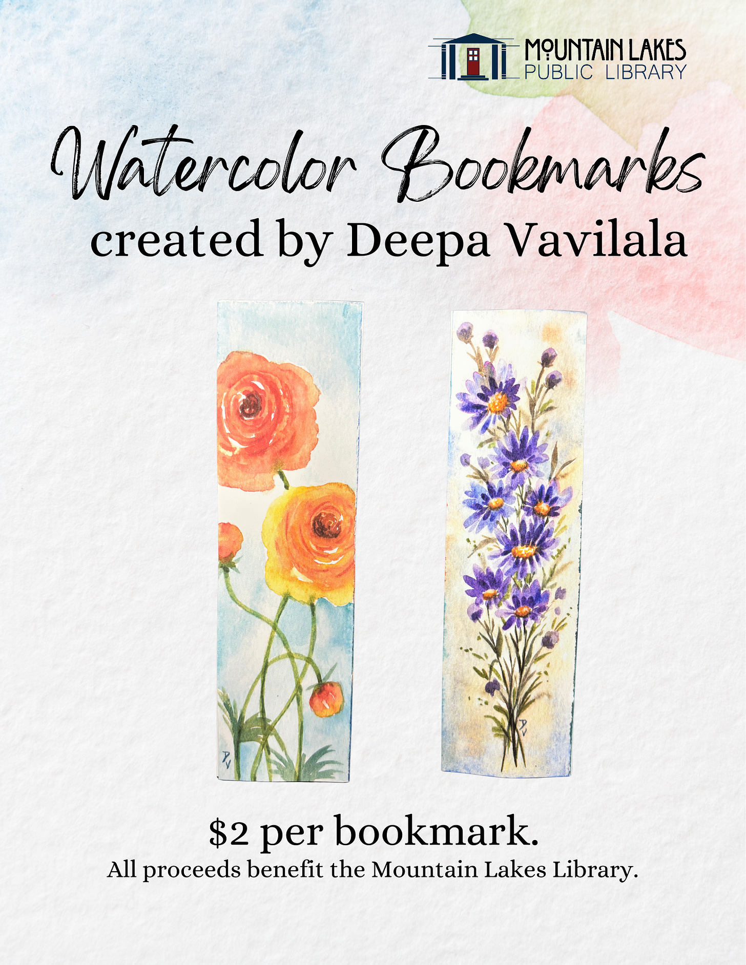 Beautiful stories deserve beautiful bookmarks! Each bookmark is handcrafted by our dear friend and talented artist, Deepa Vavilala. All proceeds benefit the Mountain Lakes Public Library.